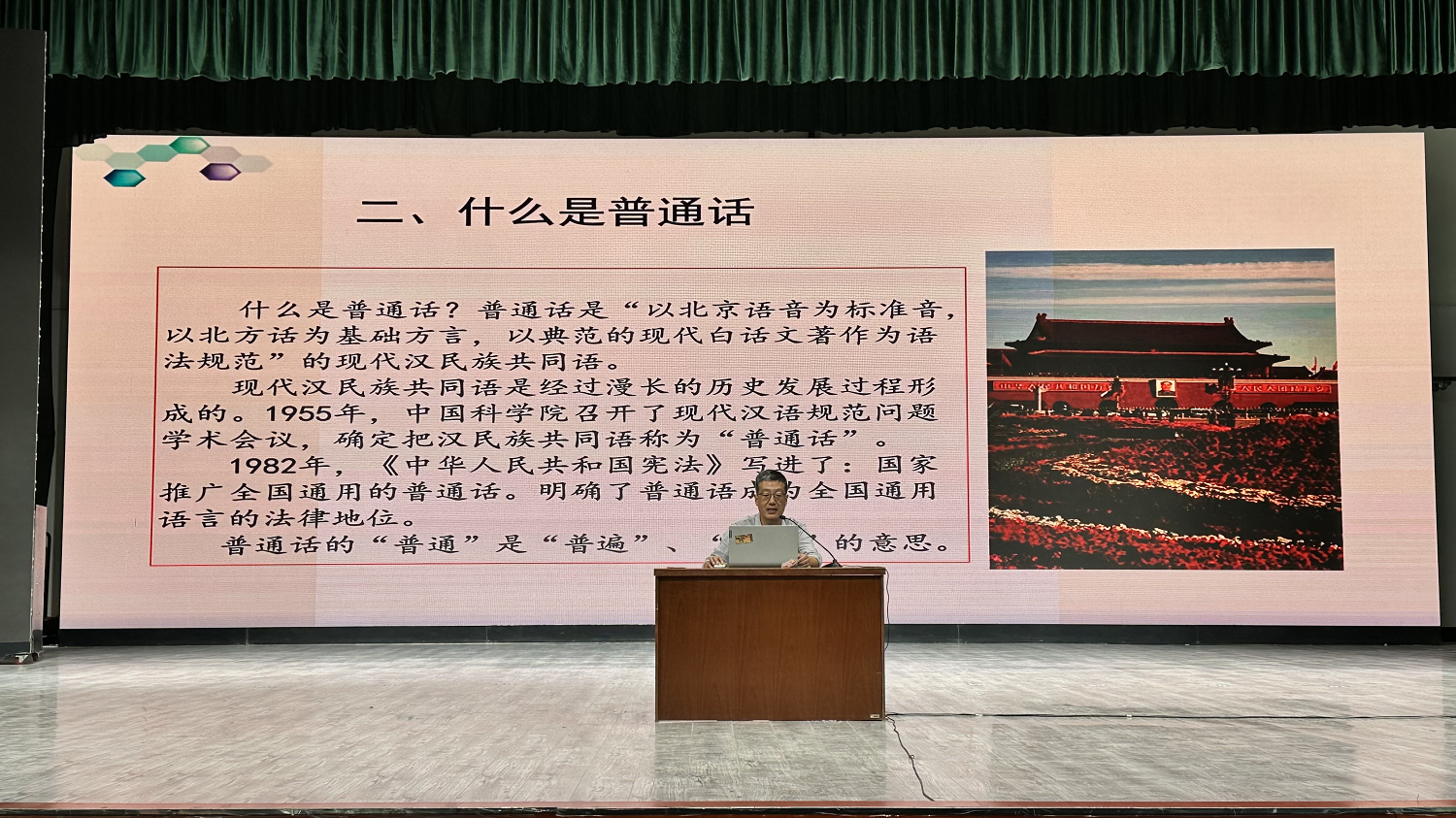 随后,李卫东老师开展了以“加大国家通用语言文字推广力度,促进铸牢中华民族共同体意识”为主题的专题讲座,进一步拓展了新生的文化视野与国家认同。